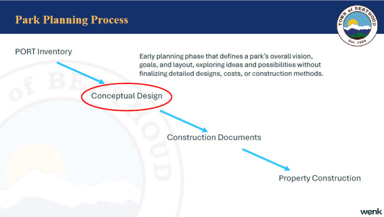 - On June 3rd, Wenk and Semple Brown will propose a Final Concept Plan to the PORT (Parks, Open Space, Recreation, and Trails) committee. You are welcome to attend (and give public comment at) this meeting at the Berthoud Town Hall (6pm meeting start).