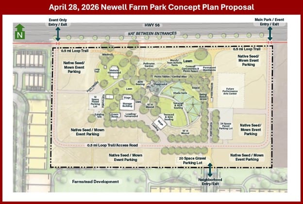 If you’re interested in more detail, you will find the full slide packet here. On that webpage, look for Agenda Item #8 on the left called “Newell Farm Park Project Concept Plan.” All of the materials are downloadable from there. Enjoy!